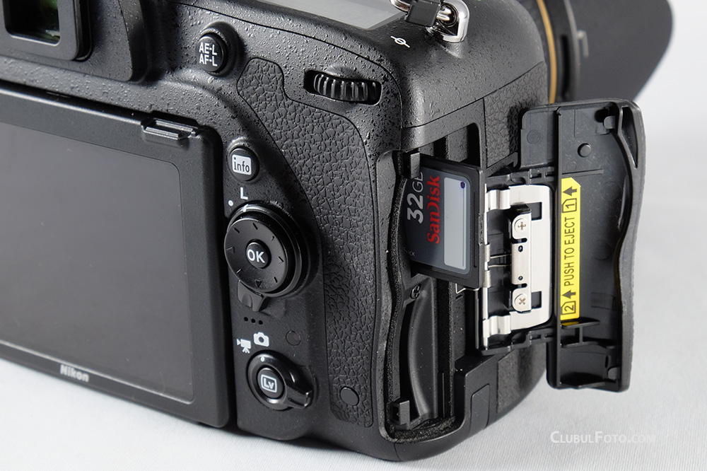 - Stocarea fotografiilor: Carduri de tip SDHC UHS-I, pentru care exista doua sloturi (ce permite atat inregistrarea simultana cat si separarea fisierelor video de JPEG-uri, pe carduri diferite sau a fisierelor NEF de JPEG-uri). Eu va recomand carduri Class 6 sau mai performante, daca vreti sa folositi si functia video a aparatului!