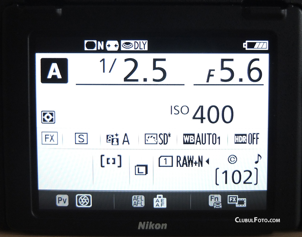 In partea de sus se regaseste ecranul LCD secundar, care afiseaza principalii parametrii de expunere (timp, diafragma, iso, compensarea expunerii), numarul de cadre ramase, autonomia acumulatorului dar nu si setarea balansului de alb. Tot aici se regaseste butonul de acces rapid la modul de masurare a expunerii (matrice, central partial, spot), butonul declansator si butonul dedicat pentru pornirea si oprirea inregistrarii video.