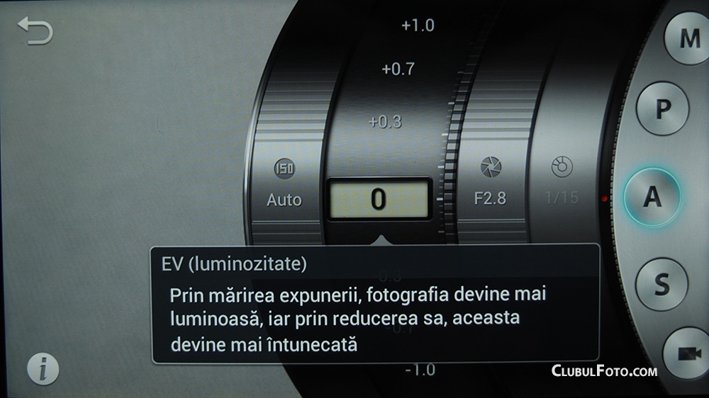 Cu ce iese in evidenta Galaxy Camera in fata oricarei alte compacte? Prin optiunile din meniu, care reprezinta o combinatie reusita intre meniul camerelor mirrorless ale producatorului coreean (vezi testul lui Samsung NX20 si NX210) si meniul standard al gadgeturilor cu Android. Spun asta pentru ca, spre marea mea surprindere, Galaxy Camera are instalat un sistem de operare modificat, care aduce utilizatorului toate modurile de lucru cu care este obisnuit de la camerele foto mai performante. Vorbim aici despre celebrele moduri P/A/S/M, care pot fi utilizate la fel ca la un aparat foto bridge sau DSLR, utilizatorul avand la dispozitie tot setul de optiuni de care ar avea nevoie: ISO, diafragma, timp de expunere, etc.