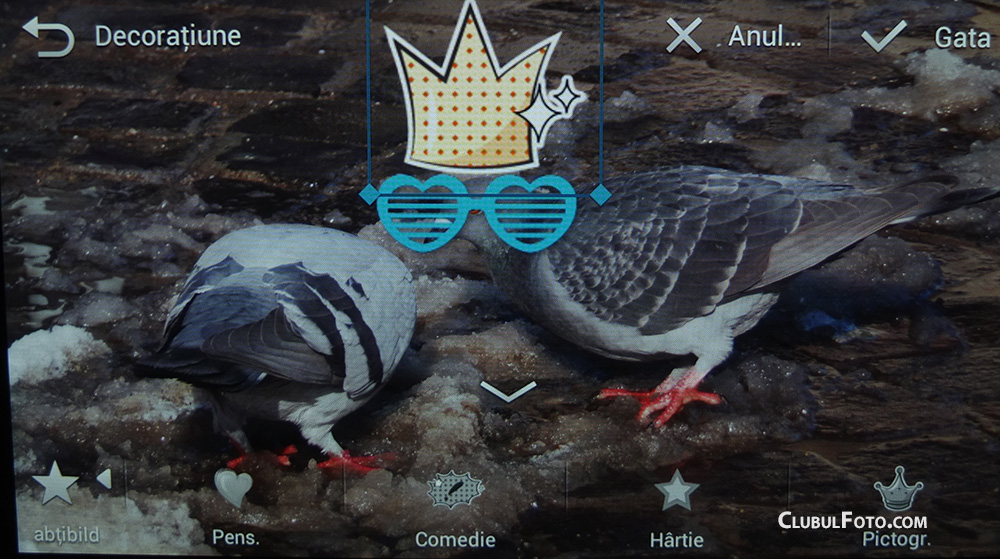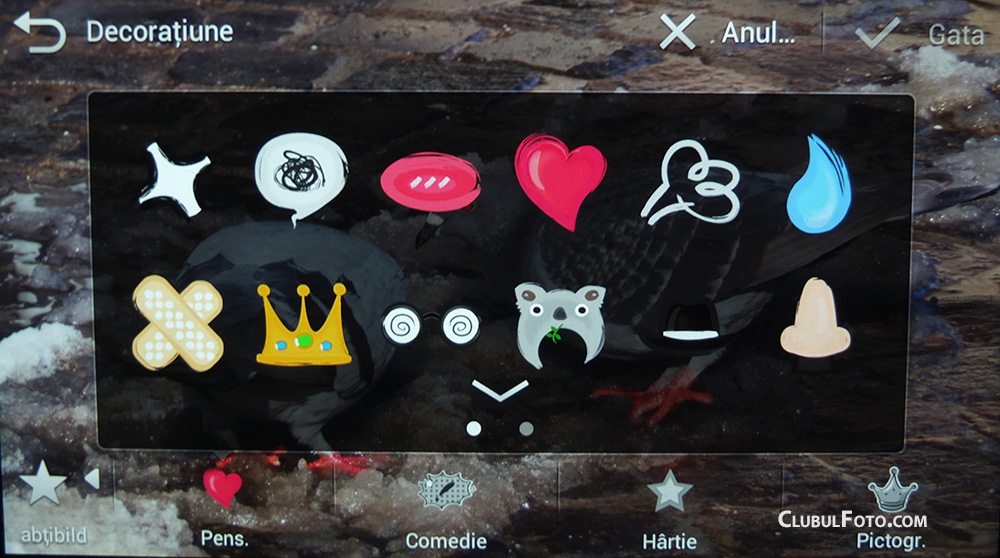 Editorul foto integrat permite aplicarea unor efecte sau pictograme clip-art pe imagini. Exista si optiuni de crop sau retusarea efectului de „ochi rosii”. Fotografiile editate sunt salvate separat, fara a rescrie imaginea originala.