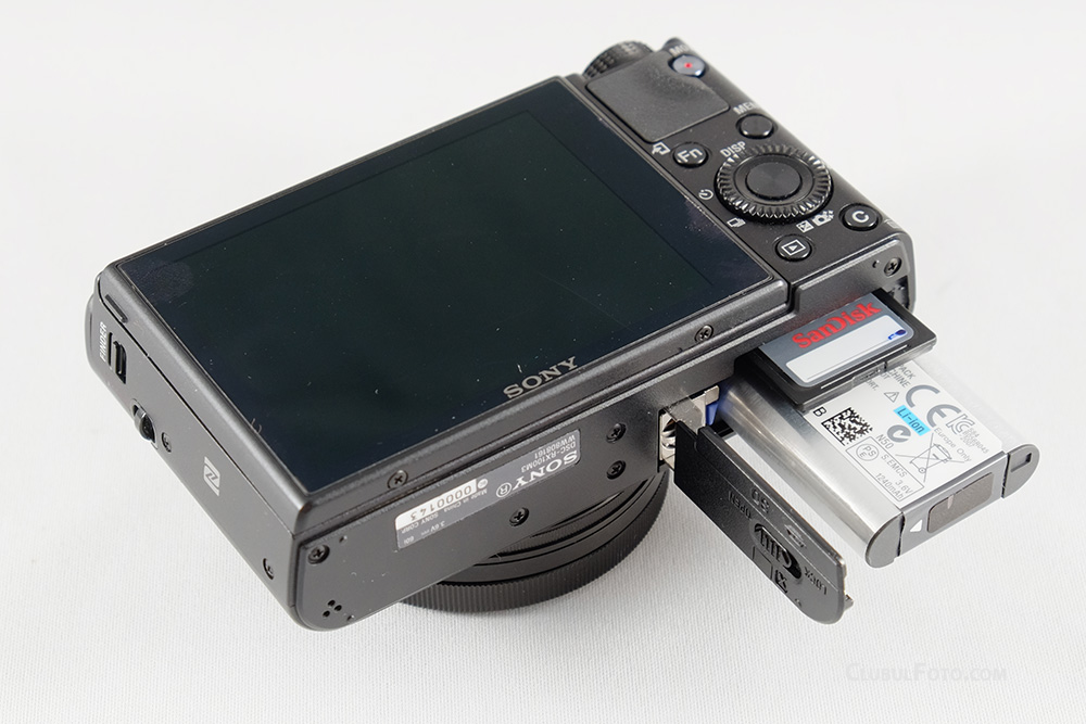 Accesul la card si acumulator se face in mod clasic, prin acelasi loc, aflat in partea de jos a aparatului. Tot acolo se gaseste si filetul pentru montarea lui pe trepied (mascat in imaginea de mai jos de capacul acumulatorului).